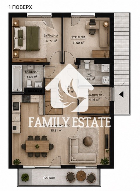 Mieszkanie idealnie nadaje się dla rodziny dzięki przemyślanemu podziałowi przestrzeni i obecności dwóch sypialni.