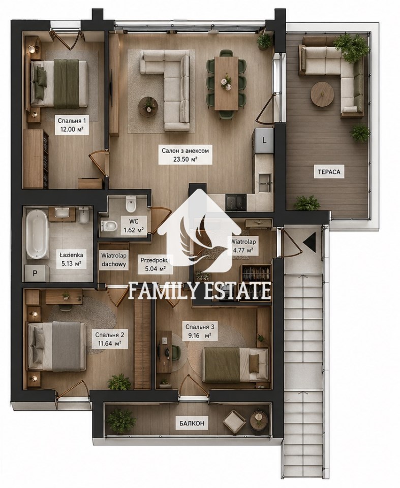 Układ mieszkania zapewnia komfortowe warunki do życia dla rodziny oraz wyraźny podział na strefy funkcjonalne.