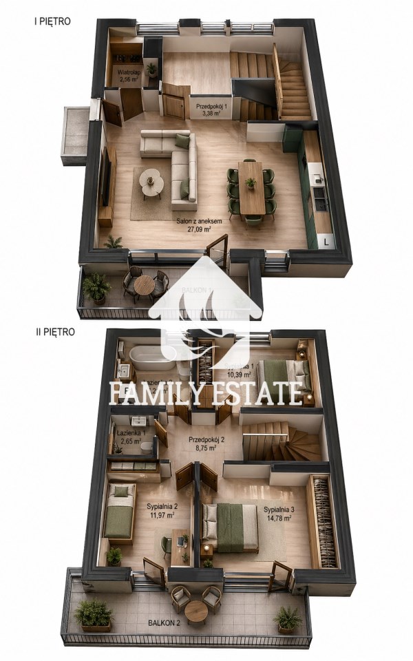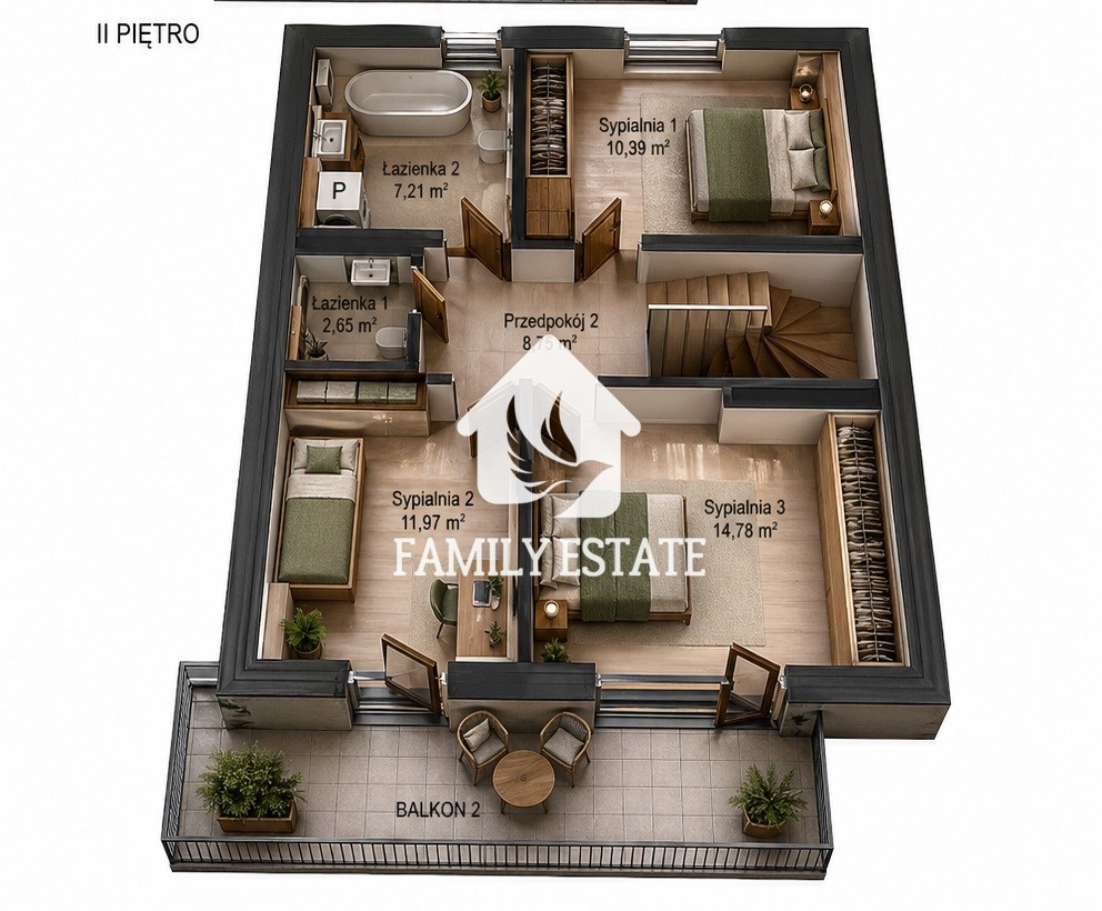 Na tym poziomie znajduje się strefa prywatna: trzy sypialnie o zróżnicowanej powierzchni, główna łazienka z wanną, dodatkowa toaleta oraz przestronny przedpokój. Dwie sypialnie mają wyjście na balkon. Przestrzeń została zaprojektowana z myślą o wygodnym życiu rodziny.