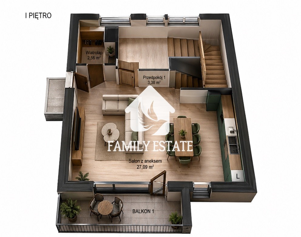 Mieszkanie jest dwupoziomowe, funkcjonalnie podzielone na strefę dzienną i prywatną.