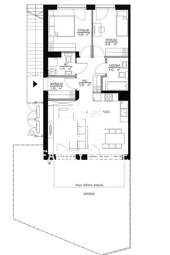 Mieszkanie idealnie nadaje się dla rodziny dzięki przemyślanemu podziałowi przestrzeni i obecności dwóch sypialni.
