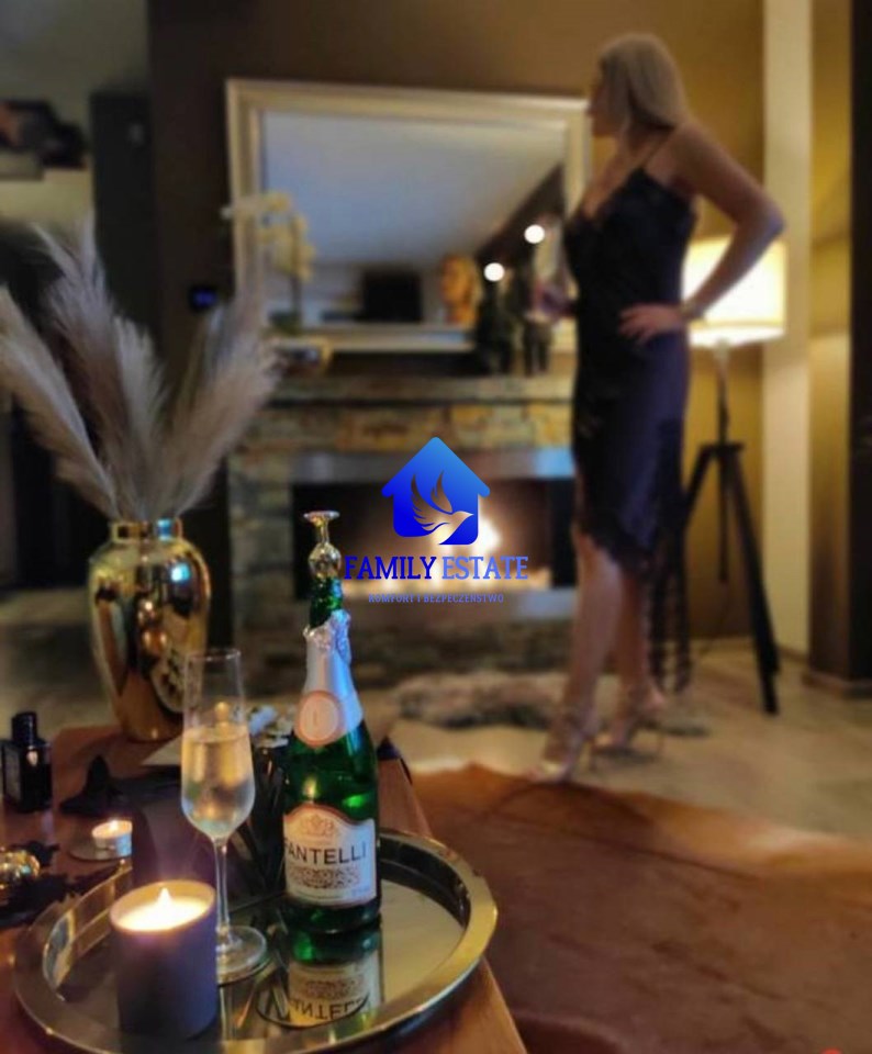 Wnętrze zaprojektowane przez architekta dla siebie — naturalne materiały, unikalne meble na zamówienie, kominek, alarm, rolety antywłamaniowe.